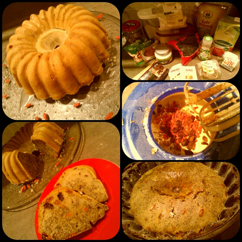 Pro rychlou přípravu používám hrníčkovou metodu. Připravíme si 2 hrníčky mouky pohankovou a špaldovou v poměru 1:1 , 3 vajíčka, 1/3 hrníčku třtinového cukru, 1 hrníček sojového mléka, 2 PL kokosového oleje (používám BIO od Saloos), kypřící prášek do pečiva nejlépe bez fosfátů ( např. zn. Provita), sáček vanilkového cukru (bio ze zdravé výživy), 1PL agávového sirupu ( BIO CountryLife) a na dochucení hrst góji ( kustovnice čínské ), 1/2 hrsti drceného lněného semínka, dýňová semínka, vlašské ořechy, rozinky, mletý mák, špetka skořice a muškátového oříšku.