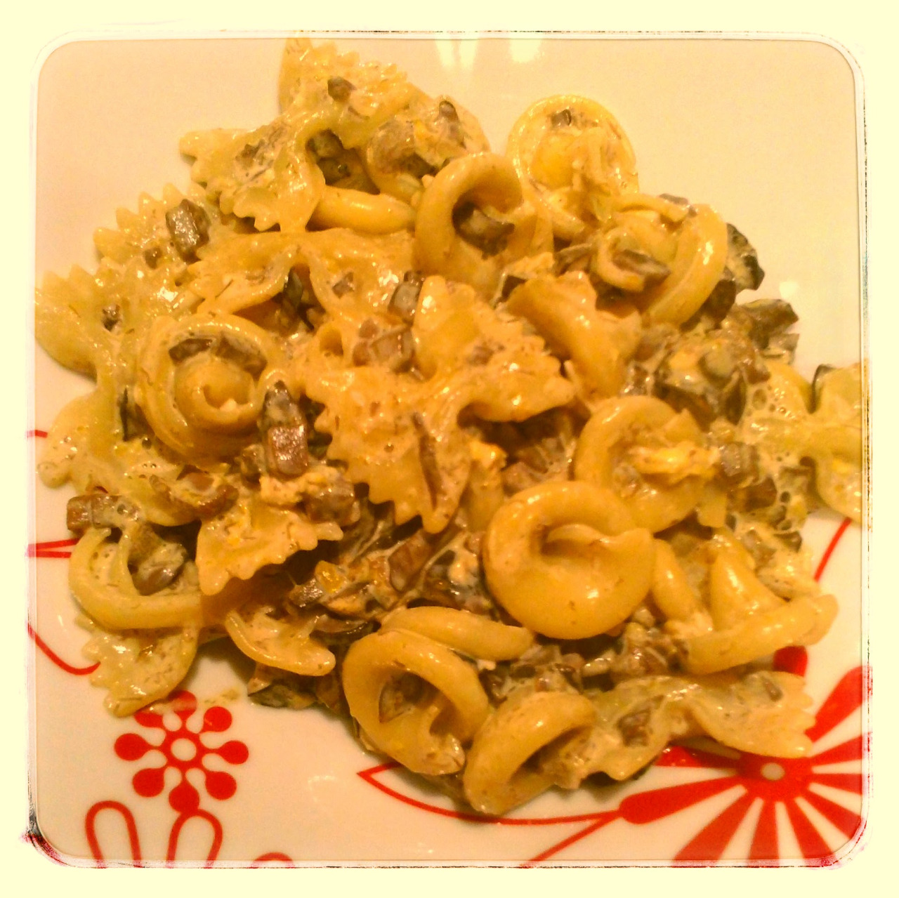 Dáme vařit těstoviny, nyní jsem použila bezvaječné semolinové těstoviny (možnost celozrnných např. Alnatura) a mezitím, pokud nemáme připravené zmražené houby ze sezóny, tak pokrájíme houby čerstvé a po orestování cibulky, dusíme houby do změknutí. Po dovaření hub dochutíme kmínem a solí, smícháme s těstovinami a přidáme vajíčko. Na závěr lze zjemnit smetanou. Dobrou chuť :-)